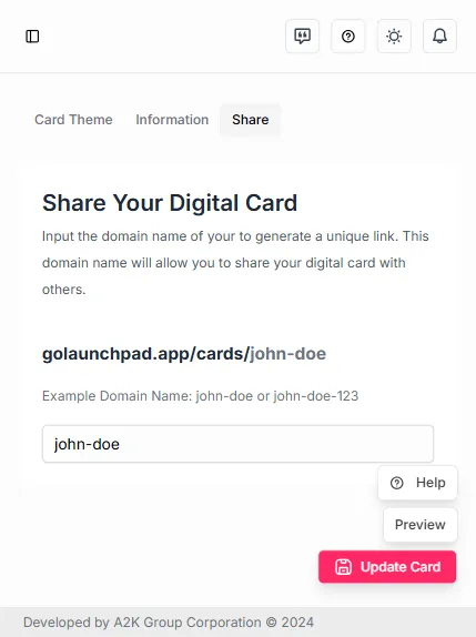 Section titled “Prepping your Card for Publication and Sharing”After you’ve finished inputting the necessary information, you can now proceed to the Share section. The Share section currently involves the user drafting a name for their digital card’s domain so that the platform recognizes it and initializes it for sharing with your friends and family.